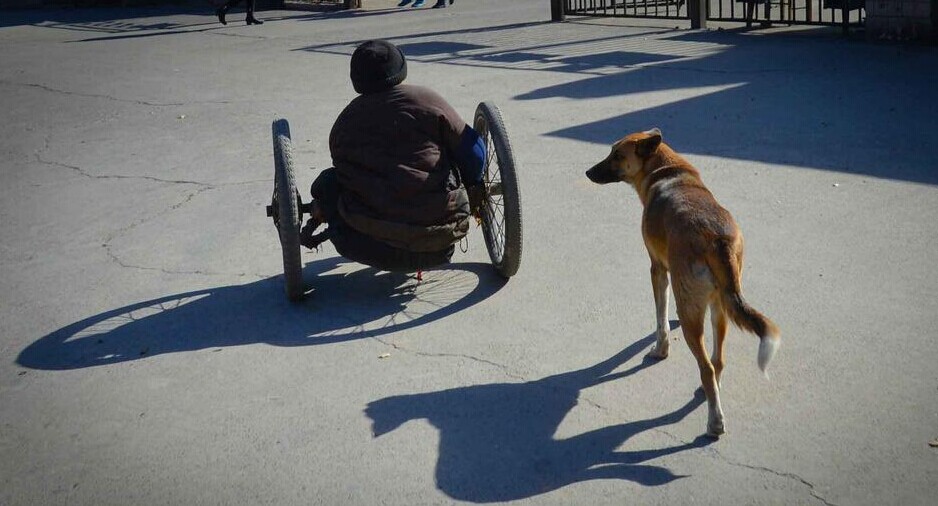 街坊们都说,老马的狗通人性,很多人都知道它。它不但会给老马看摊儿,天冷了还会给老马暖脚。老马用轮子“走路”,上坡很吃力,它就在背后使劲用前爪推老马,助他一臂之力。大黄狗奋力推老马的场景,街坊们几乎每天都能看到。